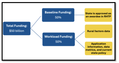 The RHTP can be seen as an answer (or even offset) to the OBBB’s cuts to Medicaid funding, which was anticipated to disproportionately impact rural hospitals. The Notice of Funding Opportunity (“NOFO”) was posted to grants.gov, a website used to apply for federal aid on the same day CMS made its announcement. The RHTP has five stated “goals,” which are slightly expounded upon in the application materials in the NOFO: