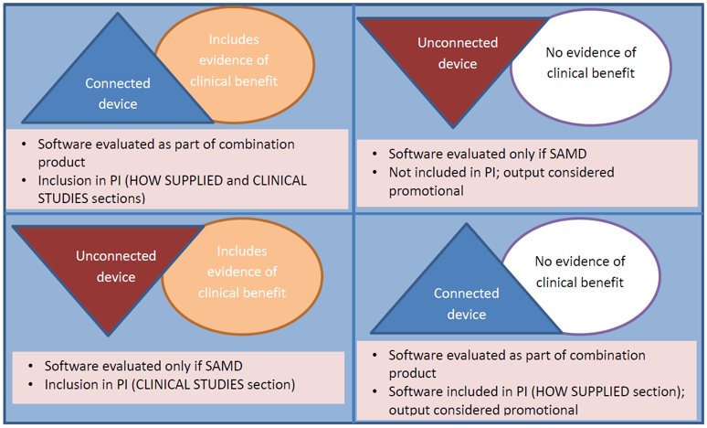 These three prongs are described as independent of one another—and in particular the guidance treats the “clinically meaningful benefit” analysis as distinct from the question of device connectivity. However, as a matter of practical application, there seems to be a significant amount of overlap, especially with respect to the question of how and where PDURS will be referenced in other sections of the PI when warranted. We decode FDA’s proposed analysis (which again, is remarkably devoid of detail on the question of PDURS that is considered necessary for safe or effective use) as follows: