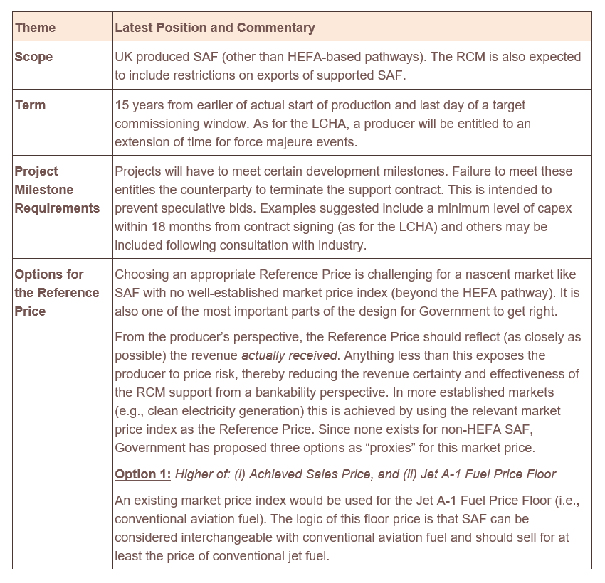 It will be important to get this relationship between the choice of Reference Price and the total volumes supported right. If the volumes of SAF production supported by the RCM, for example, exceed the amount of SAF required to meet the SAF Mandate in any year, then this might have the effect of making offtakers unwilling to commit to SAF purchase contracts (or significantly reduce the cost they are willing to pay above that for conventional jet fuel). This might, as a result, make volume risk much more difficult for producers to manage, unless there is a recognition that (with those market dynamics) the achievable price for SAF will be at or close to the price for conventional jet fuel. Because the SAF Mandate ramps-up gradually, starting relatively modestly, this scenario is quite plausible particular in the early years.