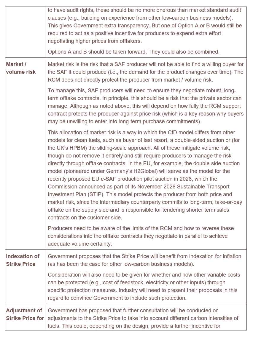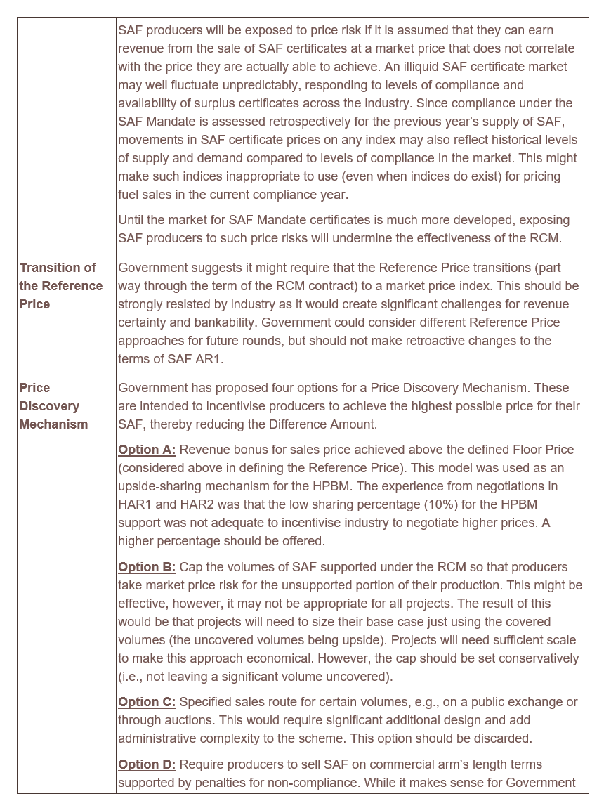 However, what the SAF industry also crucially needs is ambition facilitating scale-up. The RCM should not necessarily be held back just by the volumes that are required in the near future under the SAF Mandate, given the RCM will provide support for 15 years. But to achieve that, Government needs to ensure that the choice of the Reference Price is such as will allow the private sector to manage volume risk through contracting (without exposing the producer to an unmanageable risk of revenue shortfall). Government should also help mitigate the volume risk issue by providing some form of volume support (as was the case under the HPBM).