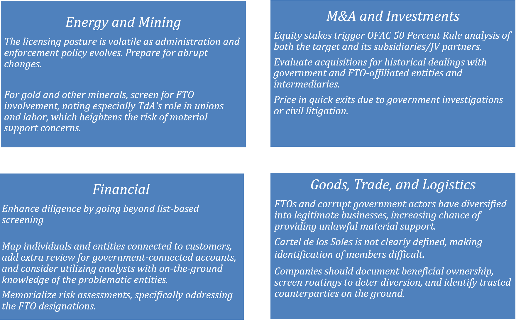 - The U.S. government has maintained its use of terrorism, corruption, and sanctions tools against Venezuelan actors and networks such that any foreign direct investment or activity in Venezuela runs a high risk of interactions with restricted parties. Such U.S. legal restrictions are based on different designations stemming from a variety of regulations. Some of these designations of restricted parties include Foreign Terrorist Organization (FTO) designations made by the U.S. Secretary of State under 8 U.S.C. § 1189. Engaging with a designated entity exposes companies to the risk under the criminal “material support” statute (18 U.S.C. § 2339B) and can create ATA civil exposure. The criminal statute has international reach and broadly prohibits providing “material support” to designated entities. The law defines “material support” broadly, increasing the chance of potential exposure where a corporation may lend such support to an FTO, even without the knowledge of leadership in the U.S.