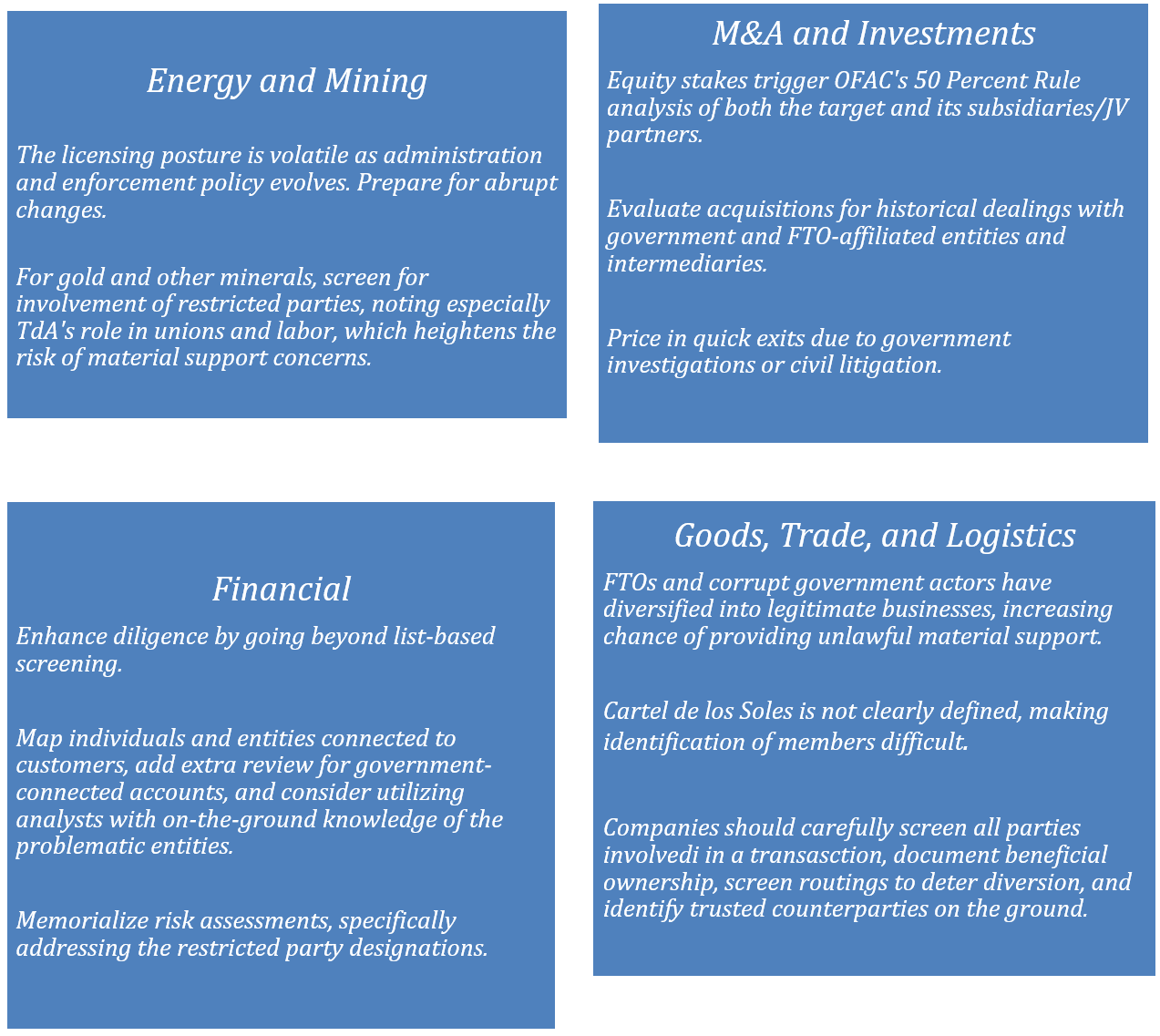 As businesses analyze the evolving facts on the ground in Venezuela, developing U.S. policy priorities, and potential opportunities, there are some risk-management steps they should consider to better position themselves: