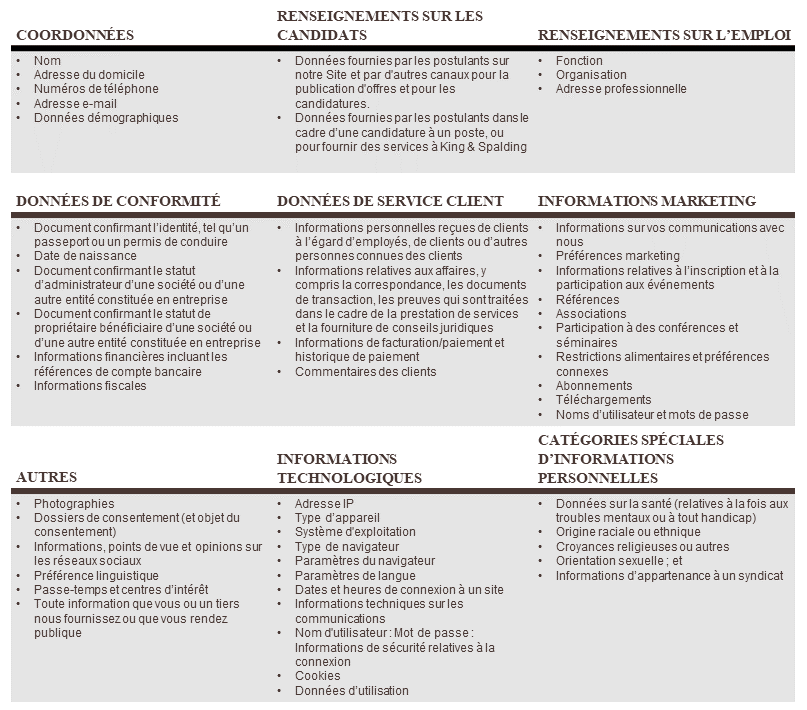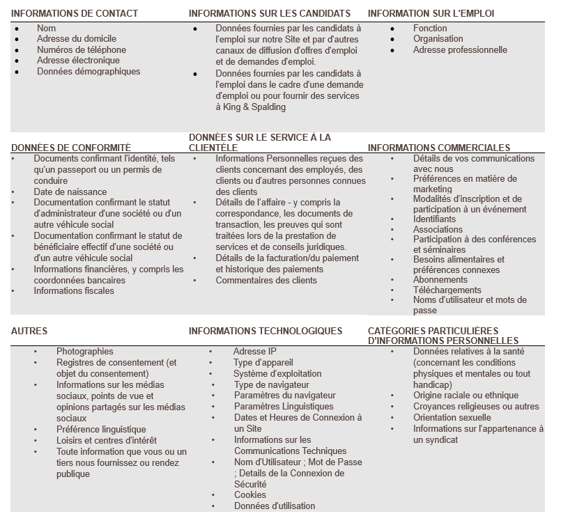 Aux fins du présent Avis de confidentialité, l’expression « Informations personnelles » désigne toute information qui, par elle-même ou en combinaison avec d’autres informations identifie ou se rapporte à une personne, un dispositif ou un foyer, les décrit, y fait référence, est susceptibles d’être associée avec ou peut être raisonnablement liée à ceux-ci, directement ou indirectement. Les Informations personnelles ne comprennent pas les informations anonymisées ni les informations autrement exclues des lois pertinentes sur la protection des données. Les catégories d’Informations personnelles collectées par King & Spalding peuvent inclure des informations de contact, des informations sur les candidats, des informations en matière d’emploi, des données de conformité, des données sur le service à la clientèle, des informations de marketing, des informations technologiques, des catégories particulières de données à caractère personnel, d’autres Informations personnelles sensibles et d’autres données, tel que décrit plus en détail dans le tableau ci-dessous: