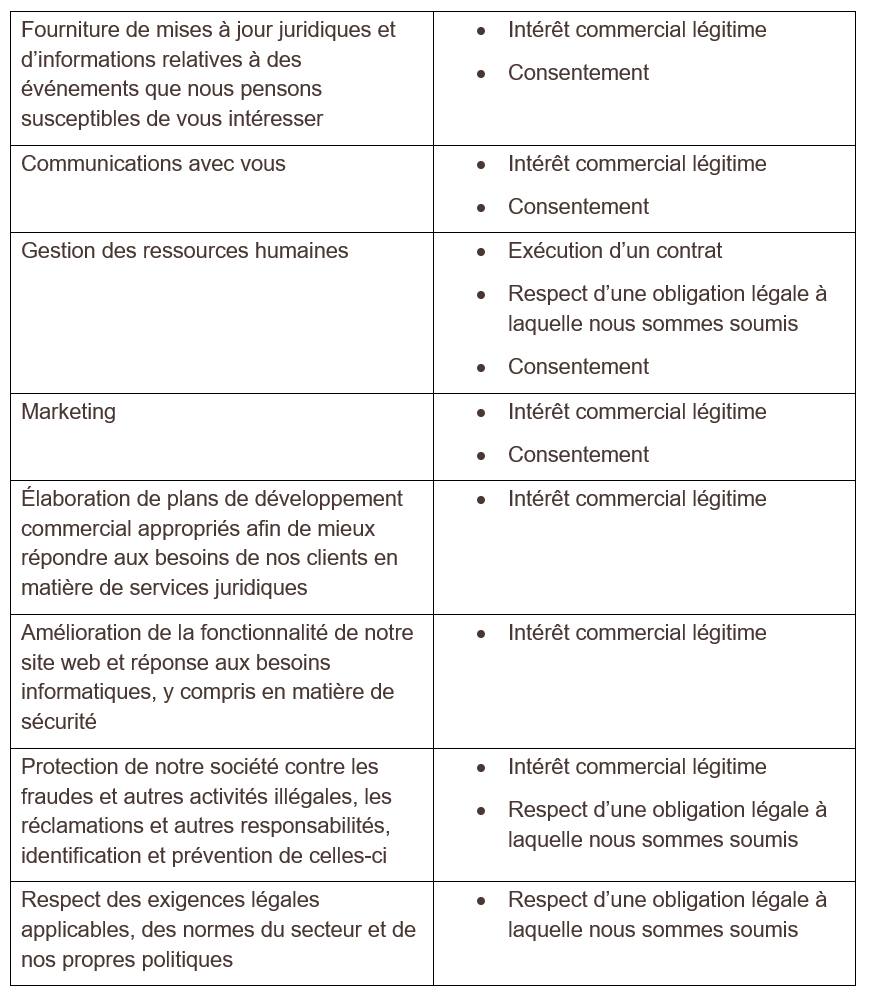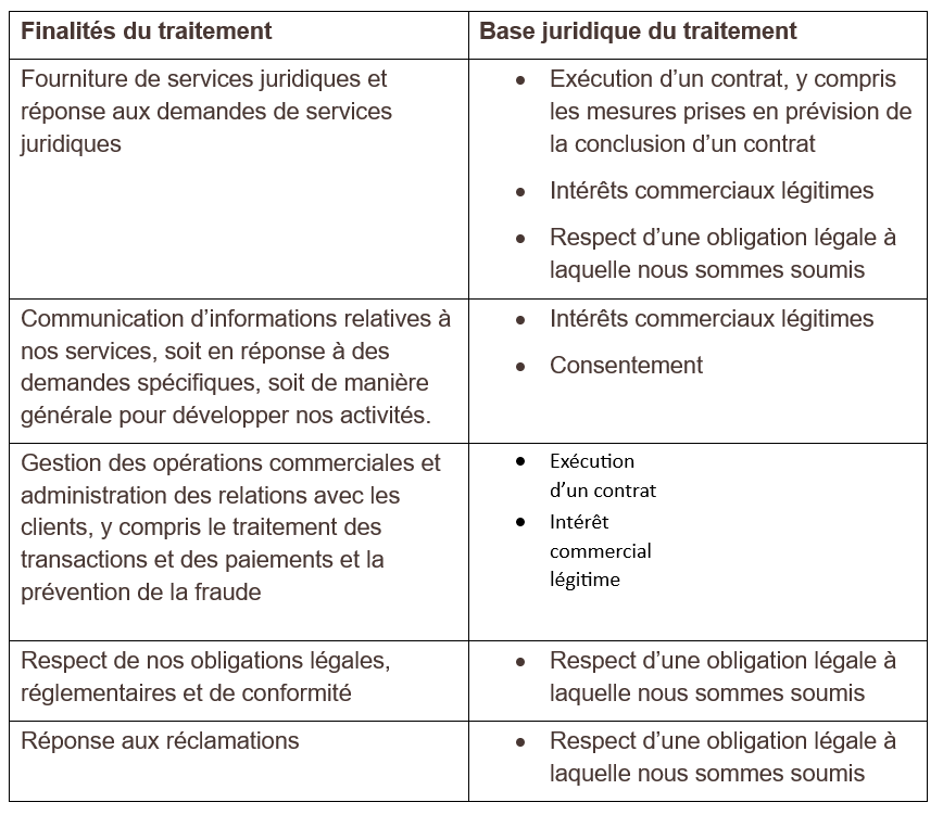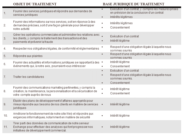 En tant que cabinet d’avocats, nous recevons régulièrement des Informations personnelles dans le cadre de la prestation de nos services et de nos activités professionnelles. Par exemple, nous pouvons collecter des Informations personnelles: