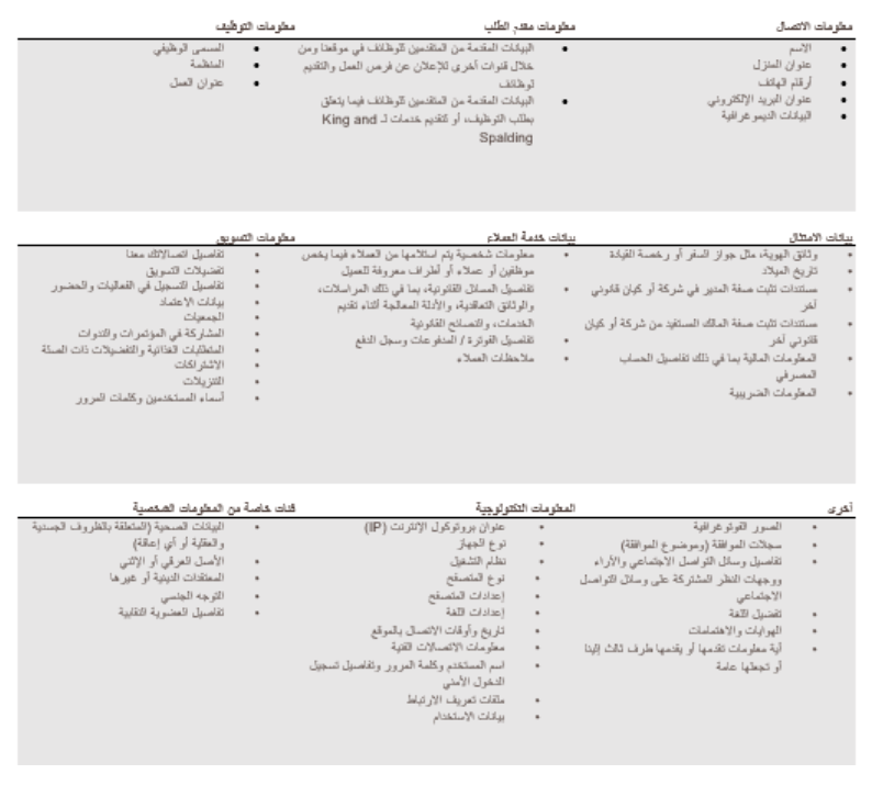 لأغراض إشعار الخصوصية هذا، يُقصد بمصطلح "المعلومات الشخصية" أي معلومات سواء بمفردها أو مقترنة مع معلومات أخرى، يمكن أن تُعرّف أو تتعلق أو تصف أو تُشير أو يمكن ربطها، سواء بشكل مباشر أو غير مباشر، بشخص طبيعي، أو بجهاز، أو بأسرة. لا تشمل المعلومات الشخصية البيانات التي تم إخفاء هويتها أو تلك التي تم استثناؤها بموجب قوانين حماية البيانات المعمول بها. قد تشمل فئات المعلومات الشخصية التي تجمعها King & Spalding معلومات الاتصال، ومعلومات المتقدم، ومعلومات التوظيف، وبيانات الامتثال، وبيانات خدمة العملاء، ومعلومات التسويق، والمعلومات التكنولوجية، وفئات خاصة من البيانات الشخصية، ومعلومات شخصية حساسة أخرى، وبيانات أخرى، وكلها كما هو موضح بمزيد من التفصيل في الجدول أدناه: